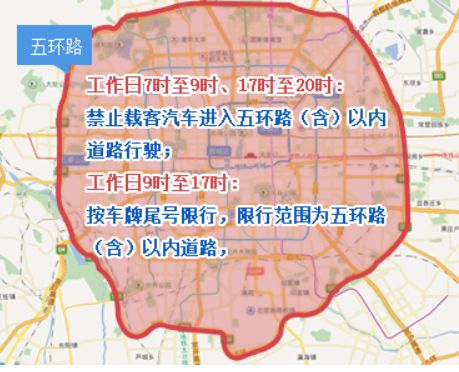 平常老百姓驾驶悬挂京牌的小型客车,在工作日的上午7点到晚上20点期间,是不可以在五环路以内的主路以及辅路进行行驶的,然而五环主路自身作为划分界限的道路是不受此限制的。限行的尾号每隔13周就会进行一次轮换,在2023年年初的时候,首轮对应的情况是周一限行5和0,周二限行1和6,周三限行2和7,周四限行3和8,周五限行4和9。