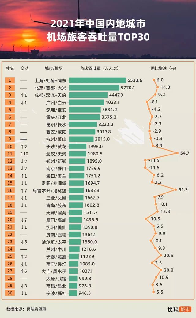 放开后,北京、上海、广州、成都这四座城市,将成为面临最大压力的城市。依据2021年内地机场旅客吞吐量数据,这四座城市稳稳占据前四位,年吞吐量全都超过4000万人次。它们分别处在我国的东南西北四个不同方向,是我国国际航空枢纽里面的核心节点。