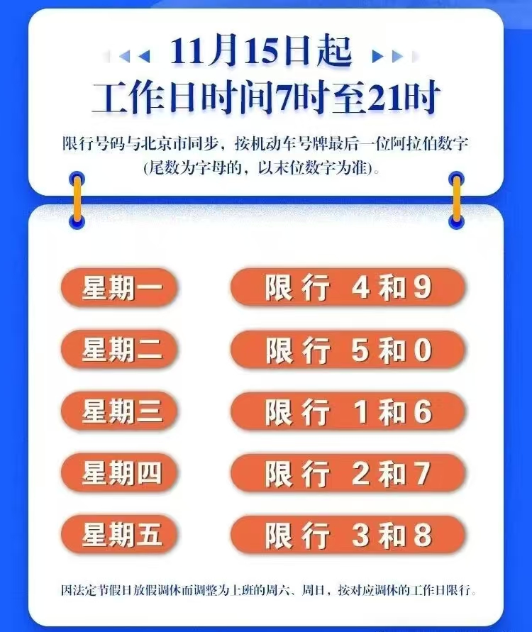 限定行驶号码与北京市保持同步,依据机动车号牌最后一位阿拉伯数字,每日限定两个号码。倘若碰到因法定节假日放假调休致使上班的周六周日,同样要依照对应调休的工作日来实行限行。这就意味着车主需要记住每日限行号码,以免闯限遭受处罚。