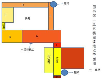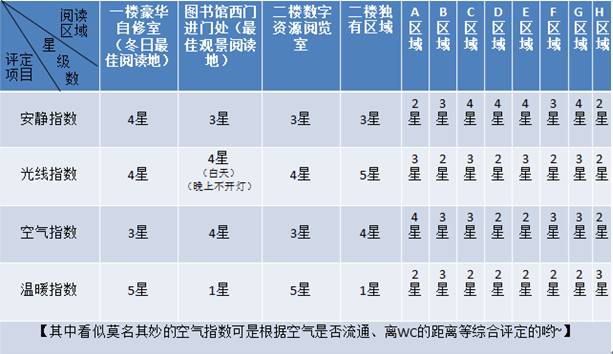 楼梯间的拐角处在五楼西侧位置,有两张小圆桌,没人注意到它们,从那里能够看到体育馆的屋顶部分。存在这样一个缺点,当晚上十点时闭馆音乐响起的时候,你必须快速地从最里面奔跑着出来才行。图书馆西门在进入之后那一排的沙发,看起来质地柔软,然而坐上大概半小时腰部就会疼痛,这种沙发仅仅适合用来翻阅浏览杂志。