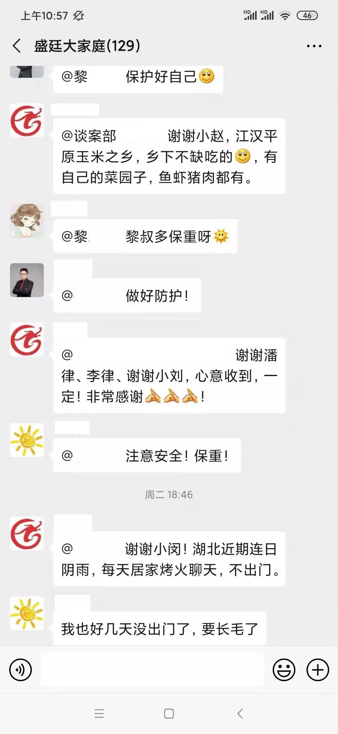 来自湖北荆州的员工小陈,春节返乡之后,便一直处于居家隔离状态,每天,他都会收到同事们发来的问候微信,有人给他寄了口罩,有人帮他联系了线上问诊资源,还有人每天准时发搞笑视频来逗他开心,小陈讲,尽管人被困在了老家,可是心却和同事们靠得更近了。