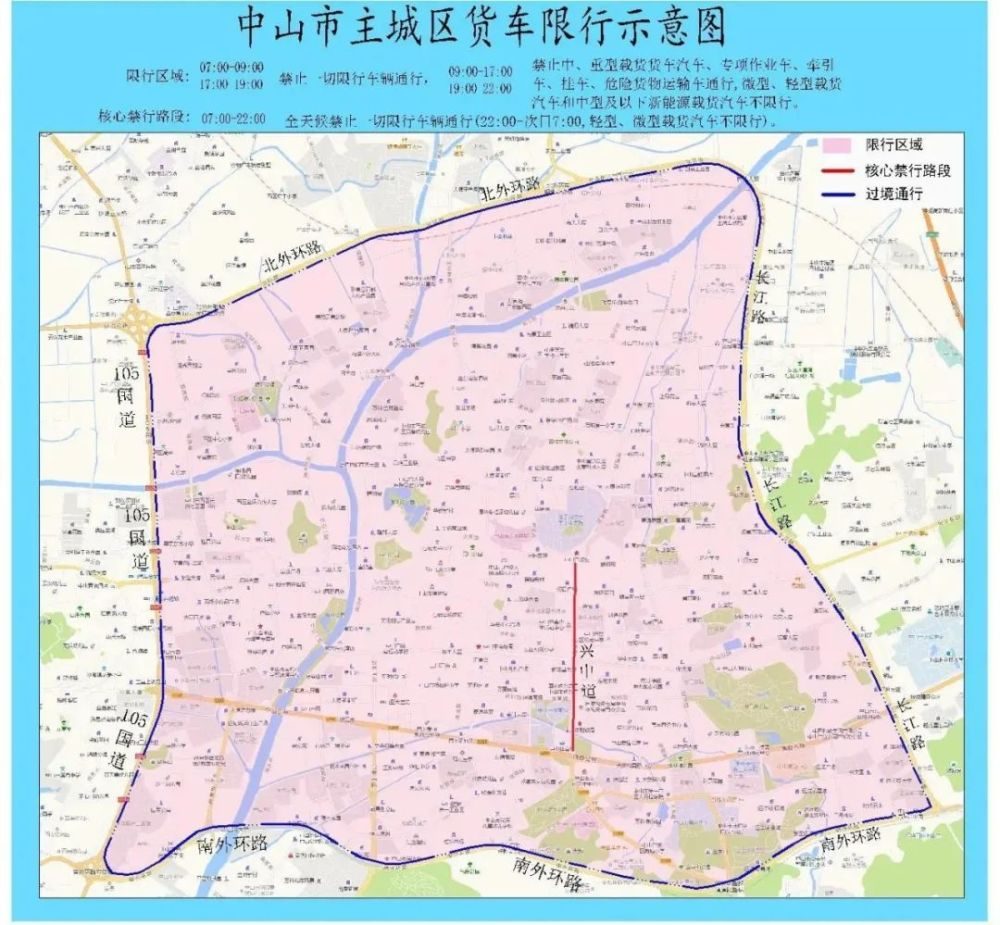 即具体而言,是处于这样一个范围内,该范围为105国道以东,北外环以南,长江路以西,南外环以北。此区域涵盖了中山主城区的大部分繁华路段。如此一来,货车司机得在脑海里重新绘制一张地图了。
