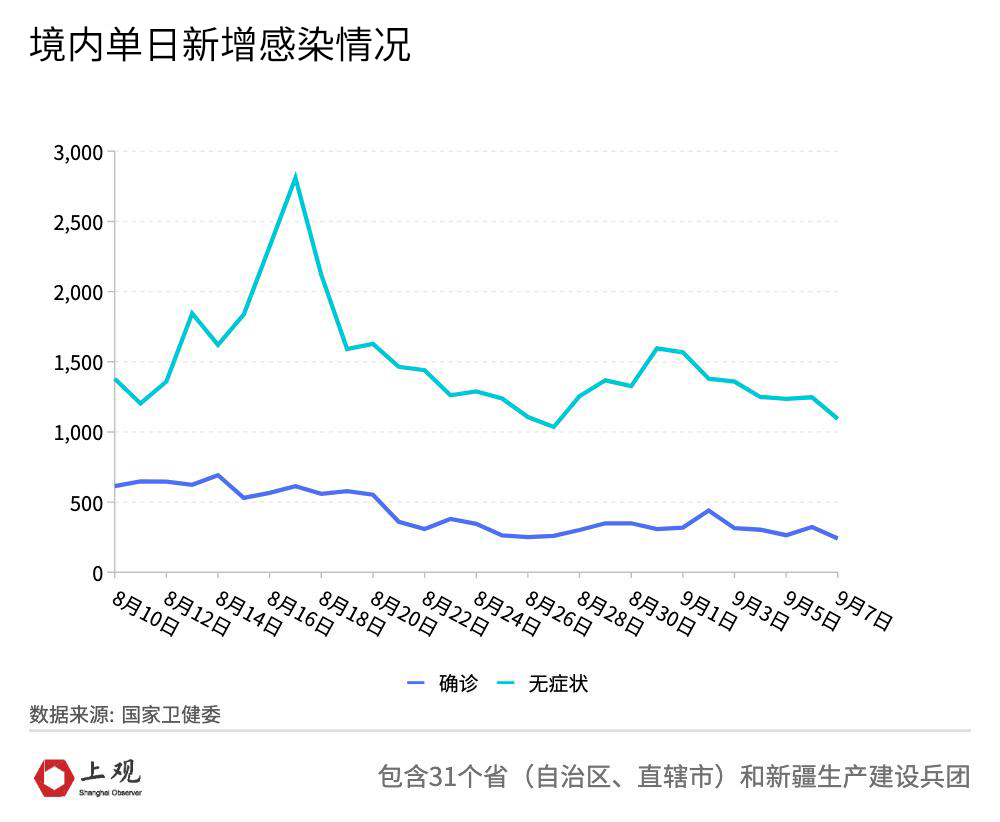 9月第一周的数据显现,境内单日新增感染人数呈波动着的下降趋向,和9月1日对照,截止7日24时,新增的总数下降了差不多三成,这样的变化表明,整体防控举措正在生出效果。然而下降趋向不均衡,各地疫情发展阶段有着明显差别,需要针对具体情形进行具体剖析。