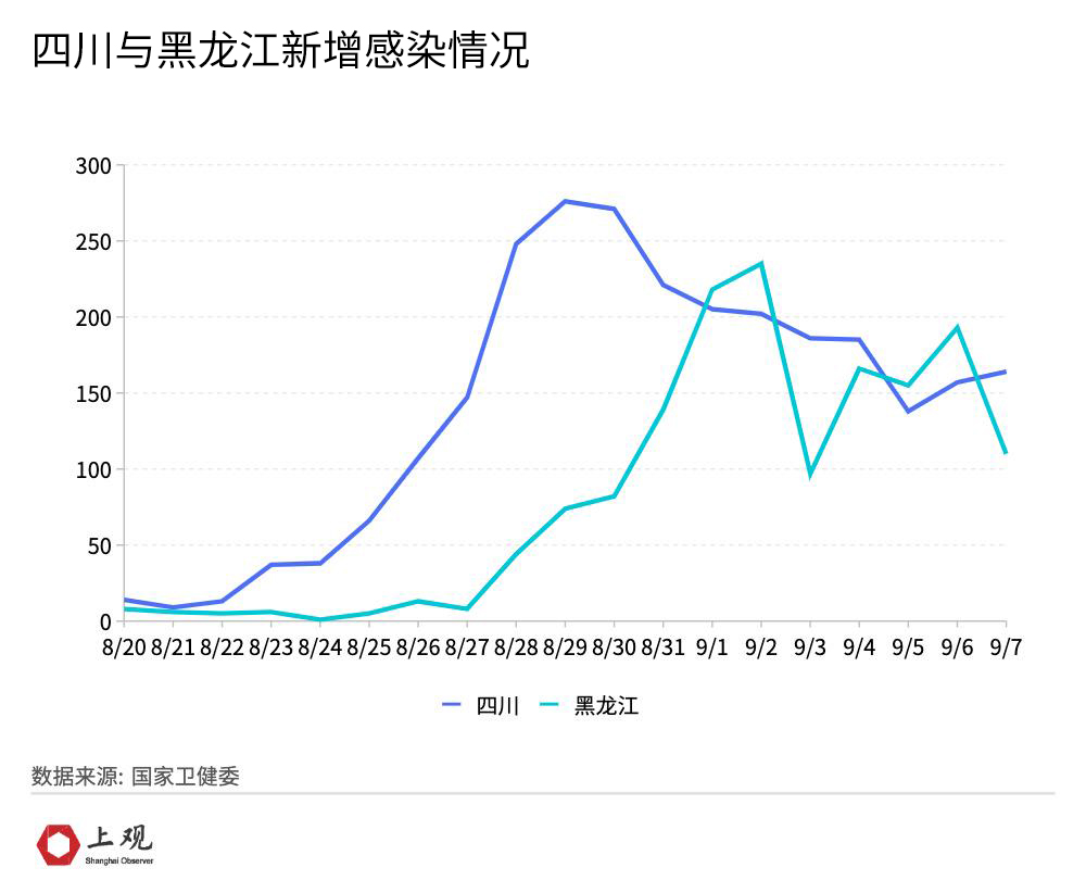 四川省的累计感染人数紧跟在西藏之后,已超过千例,黑龙江省的累计感染人数同样是紧跟在西藏之后,也已超过千例,四川疫情主要集中于成都市,截止到8日中午,该市仍然存在上千例现存感染者,社会面传播风险没能完全消除,黑龙江的疫情集中在大庆市,是由输入病例引发的,涉及服务行业人员,已在局部区域形成传播。
