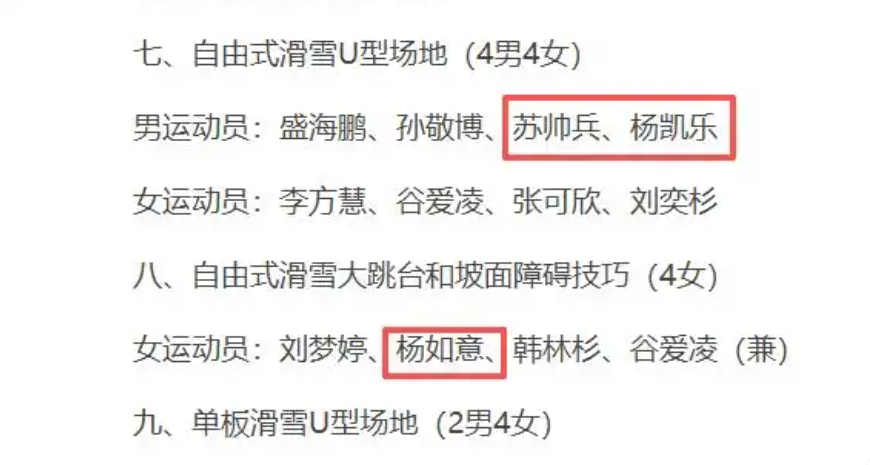 杨如意目前正在国外进行最后备战,她重点打磨大跳台动作的稳定性,教练组给她制定了每天八小时的高强度训练计划。苏帅兵和杨凯乐也在国外进行最后备战,他们在U型场地技巧上力求完善,近期训练中他俩已均能完成属于偏轴转体1260度的高难动作。