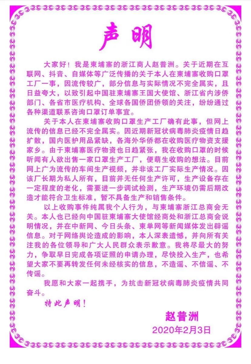 赵普洲借助媒体对外发表声明,以此来澄清事实,他宣称口罩厂的那些设备当前正在处于测试阶段,尚不具备生产的条件,在尚未获取相关证件之前是不会进行销售的,一些媒体所报道的内容并非完全属实,然而他期望工厂能够尽快实现投产,从而缓解口罩短缺的那种状况。