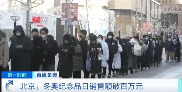 王府井大街那儿,工美大厦的门口,每天一大早,就排起了长长的队伍。此地是北京城最大的那种冬奥特许商品旗舰店,人们都裹着厚厚的羽绒服,在寒冷的风中等待着。有消费者跟记者讲了,他早上七点开始就来这儿排队,一直等到中午十二点,这才进了店,然而限购的冰墩墩早就已经卖光了。