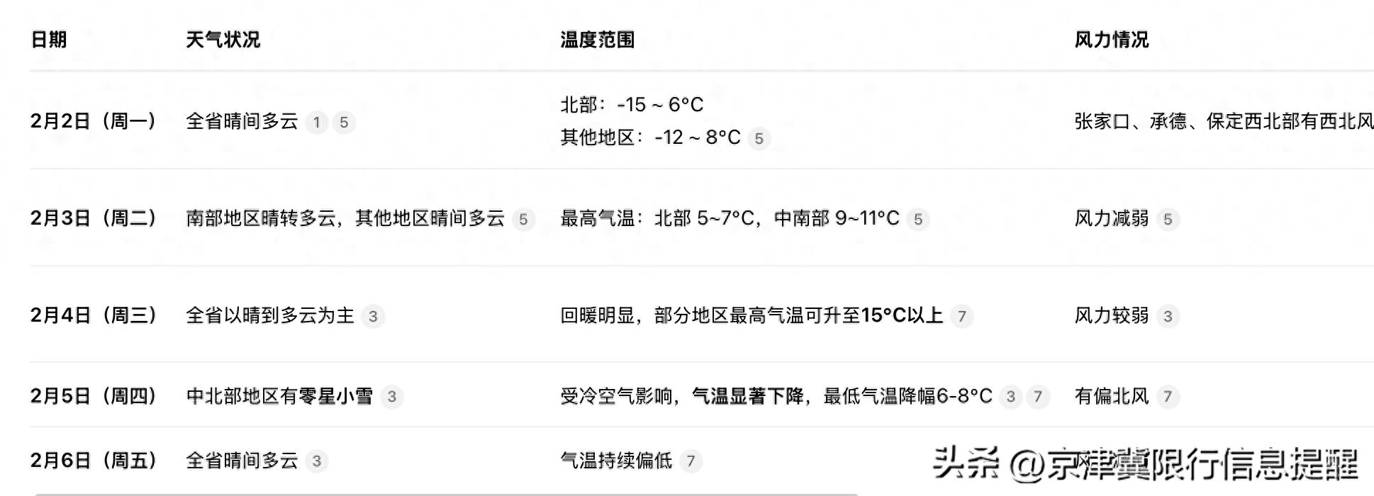 2月5日,京津冀同时同步出现降温情况,北京的最高温度仅仅才只有1度,天津是1度,河北北部的温度降到了零下,北京在当天限行1和6,部分车主挑选选择拼车或者地铁出行,地铁5号线早高峰的客流量相较于前一日增加了大约6%,天津2月6日周五天气晴朗,最低温度为零下5度,限行2和7,晚高峰时外环线的车流状况平稳,没有出现因为限行而导致出现的严重拥堵情况。