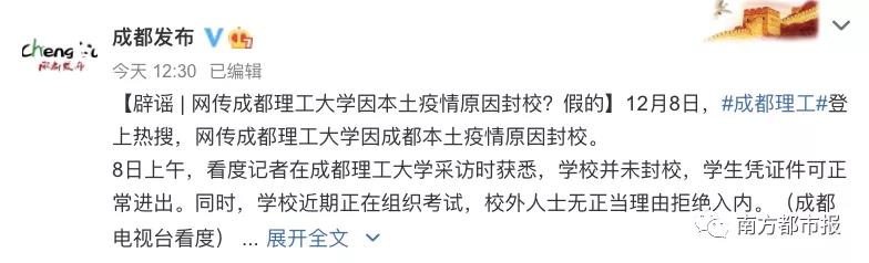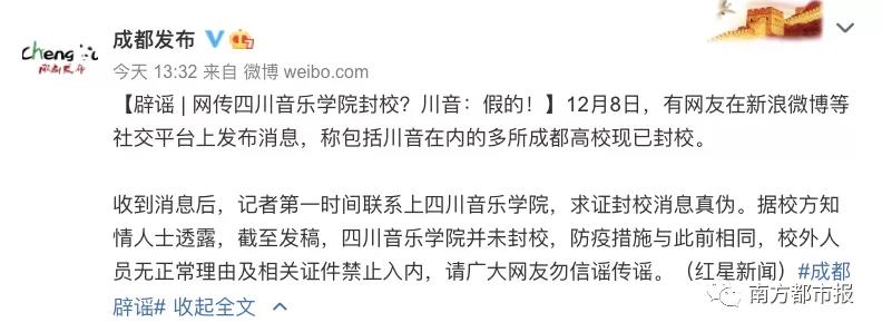 就在当天那个上午,成都理工大学猛地登上了热搜,网络上传播的消息称这所学校因为本土出现疫情所以进行了封校处理。有记者到实地去进行探访,结果发现学生凭借相关证件是完全能够正常进出学校的,那所谓的封校情况纯粹是虚假不存在的。学校方面表示最近这段时间正在筹划组织期末考试,对于外来人员所采取的管理举措属于常规性的操作。与此同时,四川音乐学院同样被编造谣言说进行了封校,该校方的知情人士很无奈地做出回应表明,防疫的相关措施一直以来都没有发生过改变,校外的人员要是没有正当的理由原本就不可以随意进入学校。