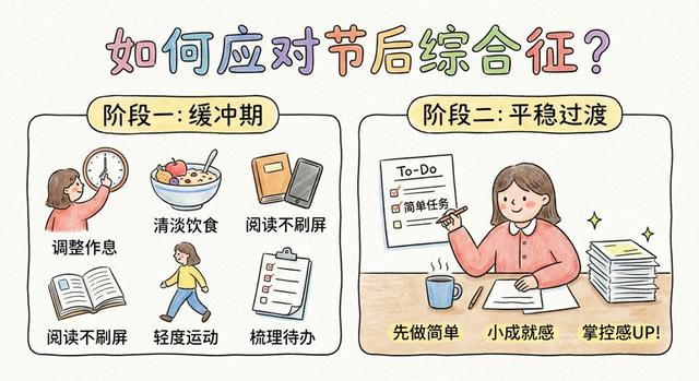 医生进行了建议,把抓住假期的最后一天当作缓冲期,由此开始对作息予以调整,依照工作节奏去重新让生物钟校准,并且配合清淡饮食,使得消化系统也能够稍作休息。