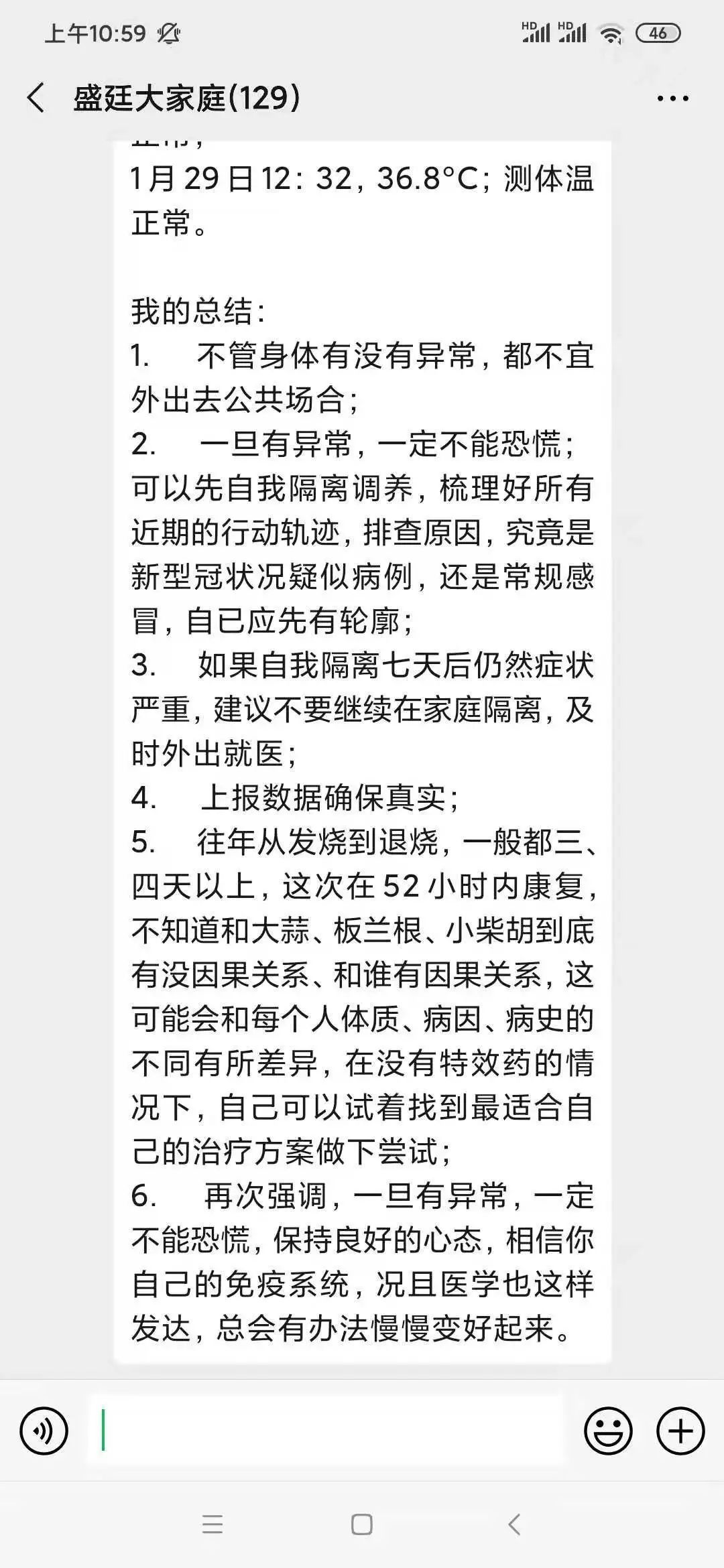籍贯为河北的同事小李,在发烧之后被进行隔离观察,尽管最终将新冠肺炎排除在外,然而这几天所历经的事情,让他内心感触极为深刻,处在退烧之后的阶段,他凭借理工男所拥有的缜密思维,撰写了一份“居家抗感冒指南”,这份指南把体温变化的曲线进行了详细记录,同时还把用药的时间点以及饮食调整的建议记录下来,这样一份带有温度的小提示,使得同事们体会到了如同家人一般的关怀。