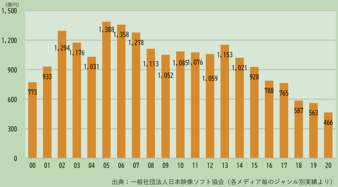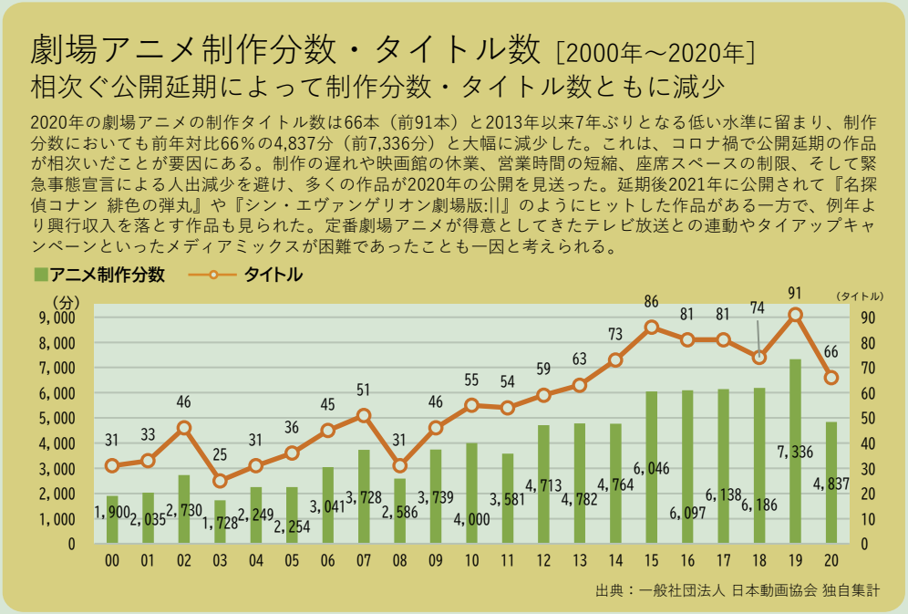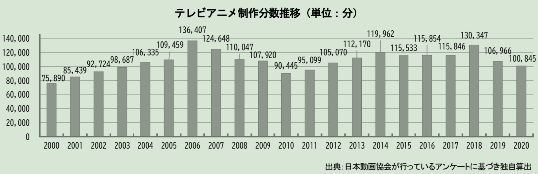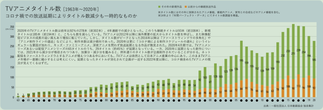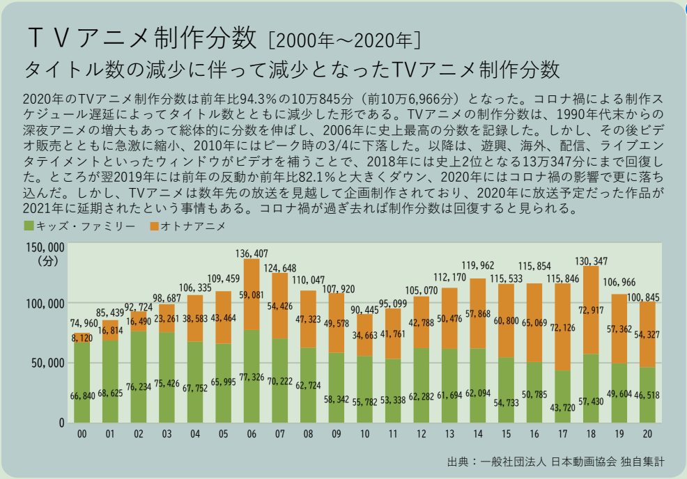 上世纪90年代起,TV动画制作时长持续增长,06年达到13万6407分钟的峰值。其后因影碟市场萎缩连续四年下降,经由游戏及海外发行等通道得以补充后逐步回升,2018年回升至13万347分钟,位列历史第二。然而2019年又下降17.9%,2020在疫情干扰下更进一步缩减。尽管通过网络发行首播的作品数量有所增多,可TV动画依旧是日本产业中央支柱,难以想象它会始终萎缩。疫情过后,延期的作品预计在2022年后逐步消化恢复。