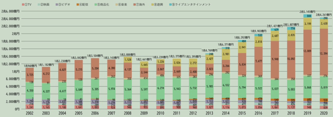 处在疫情的状况之下,宅在家里的需求促使网络发行市场迎来了那种爆发式的增长,2020年日本国内动画影像网络发行的金额达到了930亿日元,在2018年的时候超越了影碟市场之后,又在2020年超越了电视动画,在后疫情的那个时代,动画视听的方式已经明显地转向了网络发行,这样的一种趋势有希望加速,需要值得注意的是,虽然整体的市场出现了萎缩,但是角色商品化市场仍然达到了5819亿日元,大约折合318亿人民币,和前一年基本上是持平的,这表明IP的变现能力依旧是强劲的,只是渠道正在发生着转移。