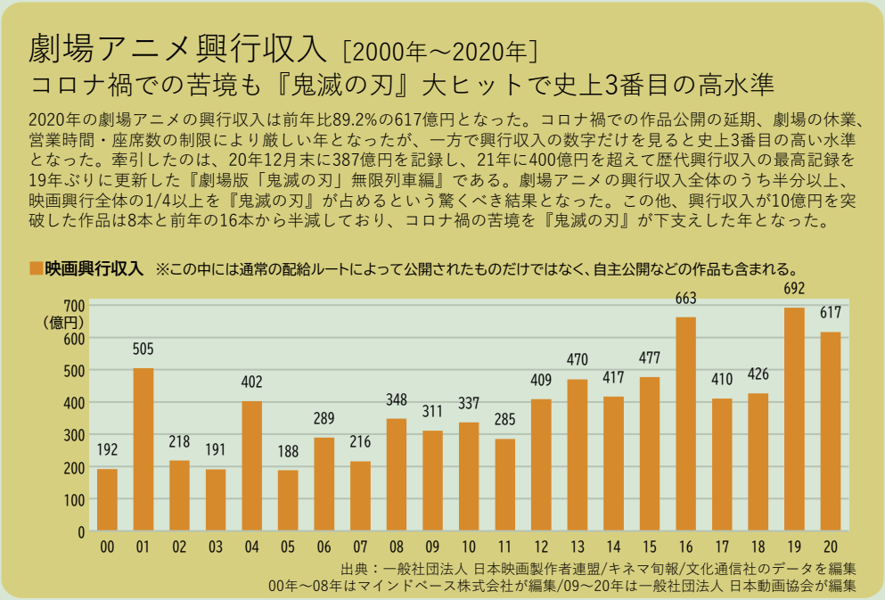 2020年,有仅8部剧场版动画票房收入大于10亿日元,与前一年的16部相比减少了一番。日本动画电影全年票房达1433亿日元,大约折合78.3亿人民币,和上一年相比下降了45.1%。然而本国制作动画的票房是617亿日元,约折合33.7亿人民币,同比仅仅下降10.9%,在票房历史中位居第三名。《鬼灭之刃》依靠一部作品就稳住乐在疫情情况下动漫市场的整体规模。跟日本相较,北美市场遭受的冲击更为严重,其全年票房为2103亿日元,与同比相比下降了81.4%;中国市场的滑落态势同样显著,不过在2019年存在《哪吒之魔童降世》这个特殊因素。