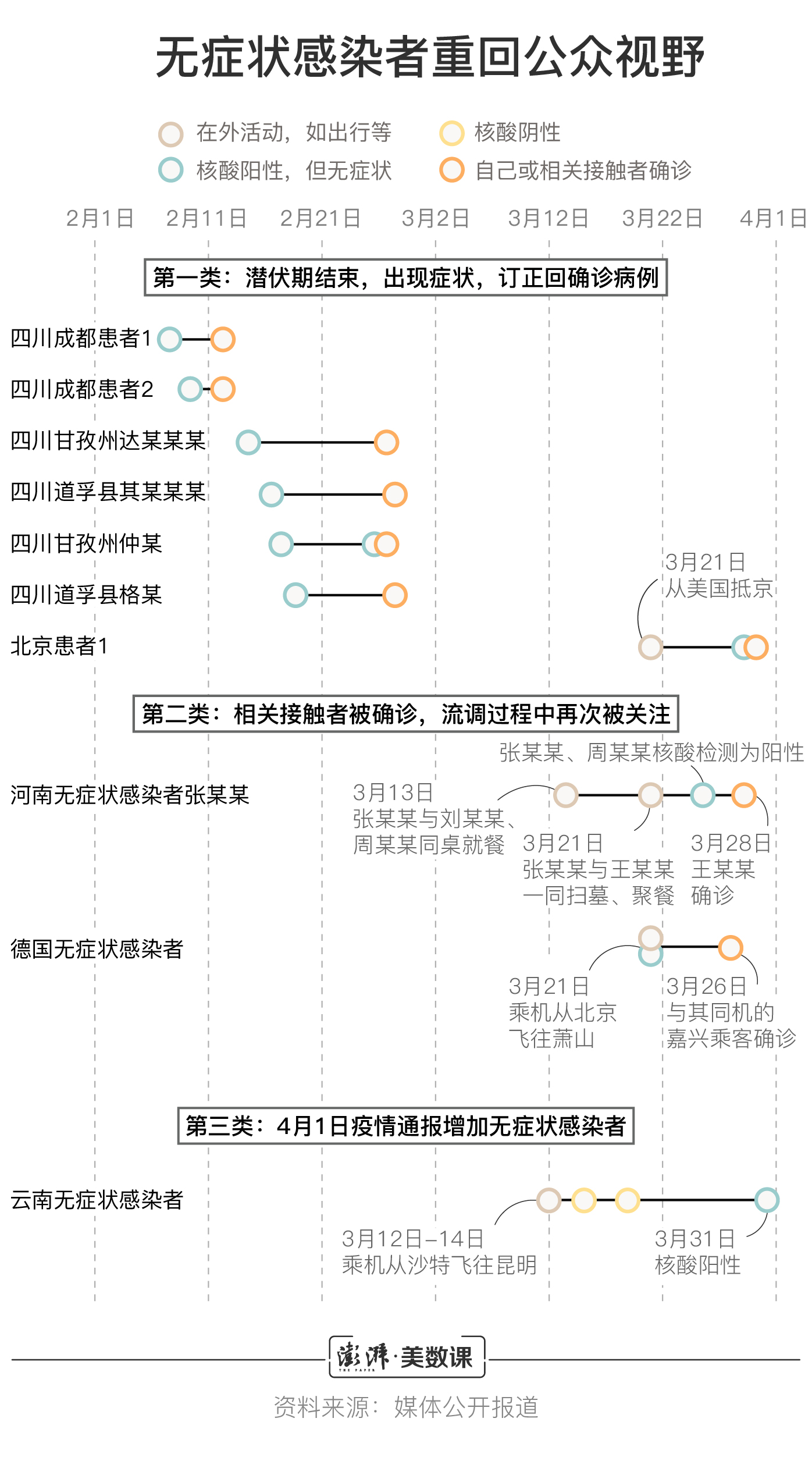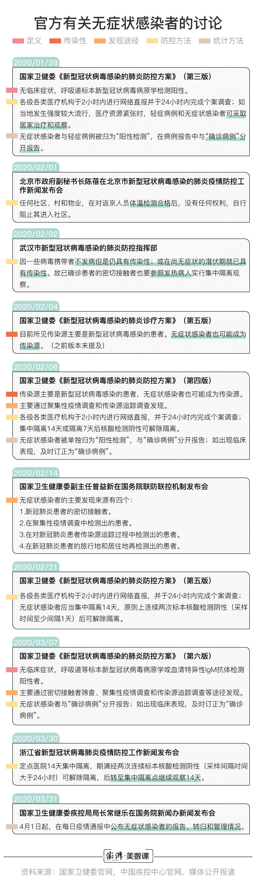 新冠肺炎的潜伏期基本是处于 1 到 14 天的范围之内,好多无症状感染者实际上正是处于潜伏期时候,2020 年 3 月 31 日的那 130 例新增当中,第二天就有 2 例转变成为了确诊病例,最开始被归为无症状,过了几天后症状显现出来了,就要修改为确诊,这样的时间间隔就是潜伏期,国家卫健委的统计规则是非常明晰的,没有症状的时候不算入确诊,出现症状马上进行订正,这表明每天公布的无症状感染者数量,实际上是一个处于流动状态的、随时会变化的人群。