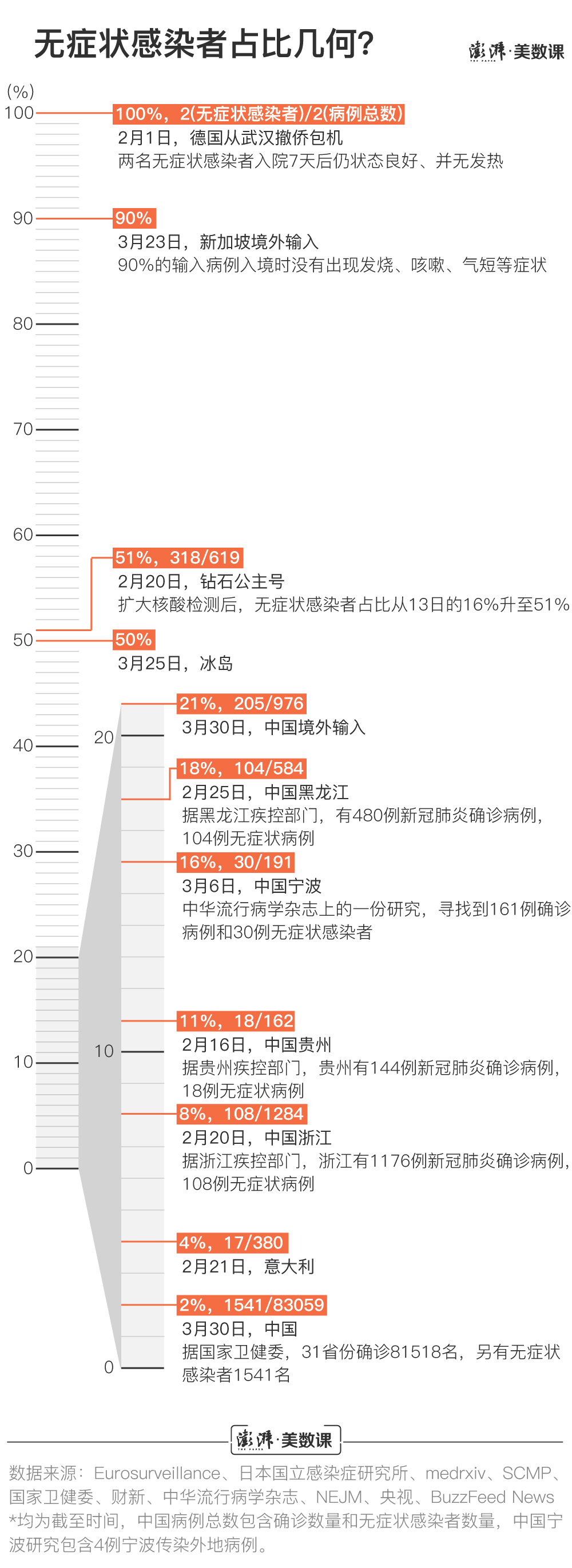 拥有全球检测比例最高的冰岛,有36万人口,检测人数超过1万人,阳性者里大概半数没有症状。武汉当时所做的几项小范围抽样调查,无症状比例从百分之几到百分之二十几都存在。在中国的数据之中,3月31日尚在医学观察的1367例,置于全国累计确诊数万例的背景状况下,占比并不算高。然而专家心里都明白,检测多少人、检测哪些人,直接决定能够看到多少无症状感染者。