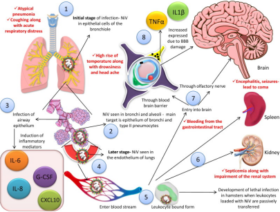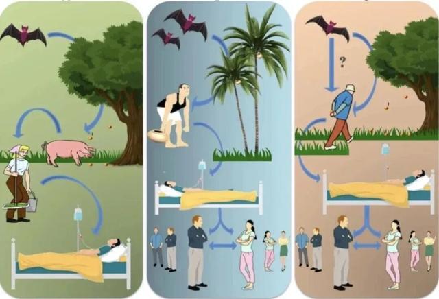 人类受到尼帕病毒感染,主要借助三条清晰的途径,其中最常见的是,直接和呈现被感染状态的猪等中间宿主相接触,或者去进食被身上带有病毒的果蝠污染过的水果,又或者饮用被携带病毒的果蝠污染过的生果汁。
