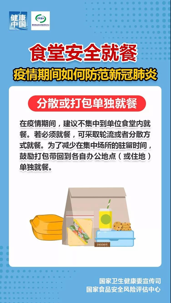 疫情时期,单位食堂变为高风险地带,缘由是大家都得摘下口罩,国家卫健委提议食堂实施分时段错峰就餐方式,保持一米以上间距,防止面对面就坐,有条件的单位能够鼓励员工打包带回工位进食,食堂桌椅于每次使用之后都要开展消毒。