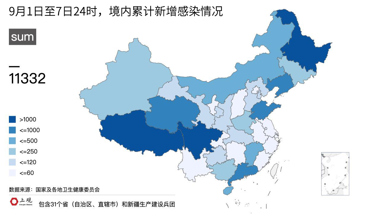 9月第一周的数据显现,境内单日新增感染人数呈波动着的下降趋向,和9月1日对照,截止7日24时,新增的总数下降了差不多三成,这样的变化表明,整体防控举措正在生出效果。然而下降趋向不均衡,各地疫情发展阶段有着明显差别,需要针对具体情形进行具体剖析。
