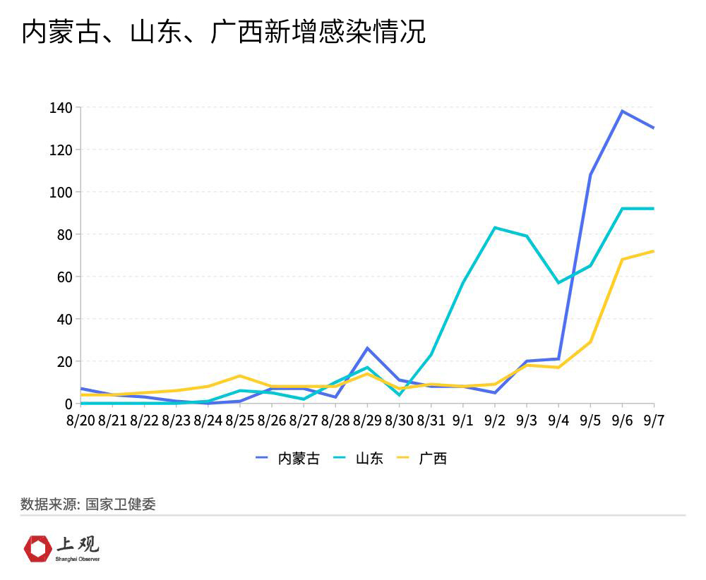 9月5日,内蒙古单日新增突破百例,赤峰市作为内蒙古主要受影响区域,病例数占全区现存病例的一半以上,此地疫情已进入中心城区,其源头仍在排查中, 当前内蒙古、山东和广西三地的疫情处于发展阶段。