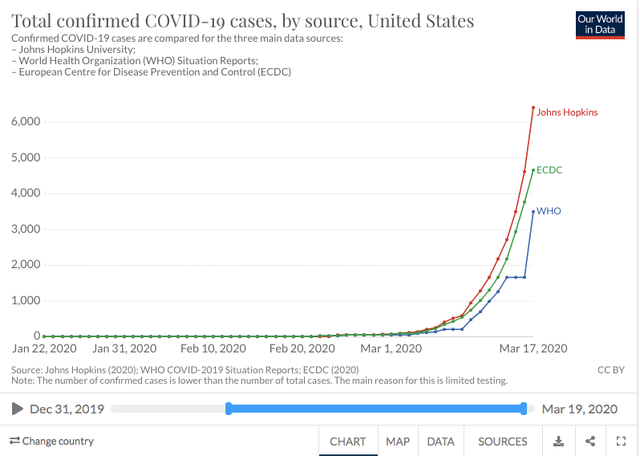 网站“用数据看世界”,此网站由牛津大学创立,该网站透露信息,他们在最初的时候,同时参考了三个数据源,分别是世卫组织、欧洲疾控以及霍普金斯,但待到后来,他们果断放弃了世卫,原因非常直接,其一,在3月18日时,世卫于每日统计截止时间方面突然做出修改,其二,数据库曾经出现过明显错误。